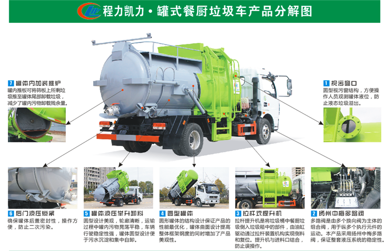 餐廚垃圾車,又稱餐余垃圾車、余廚垃圾車或者泔水車,是用于收集和運輸生活垃圾、食品垃圾(泔水)及城市淤泥的專用車輛,改裝部分具有裝、卸垃圾自動化程度高、工作可靠、密封性好、裝載容積大、操作簡便、作業過程密閉,無污水泄露和異味的散發,環保性好等特點。可配裝載不同規格的標準垃圾桶,具有廣泛的適用性。
