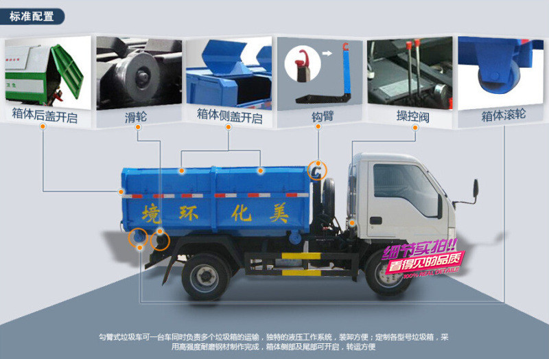 鉤臂垃圾車又稱為車廂可卸式垃圾車,用全液壓控制操作系統(tǒng),垃圾廂與底盤可徹底分離,具有結(jié)構(gòu)合理,操作簡便、穩(wěn)定、使用效率高、密封性能好、傾倒方便等優(yōu)點,能實現(xiàn)一臺車與多個垃圾廂聯(lián)合作業(yè),循環(huán)運輸,充分提高車輛的運輸能力。主要適用于市政環(huán)衛(wèi)、物業(yè)管理、大型廠、工礦等各種場所收集、運載各種垃圾。