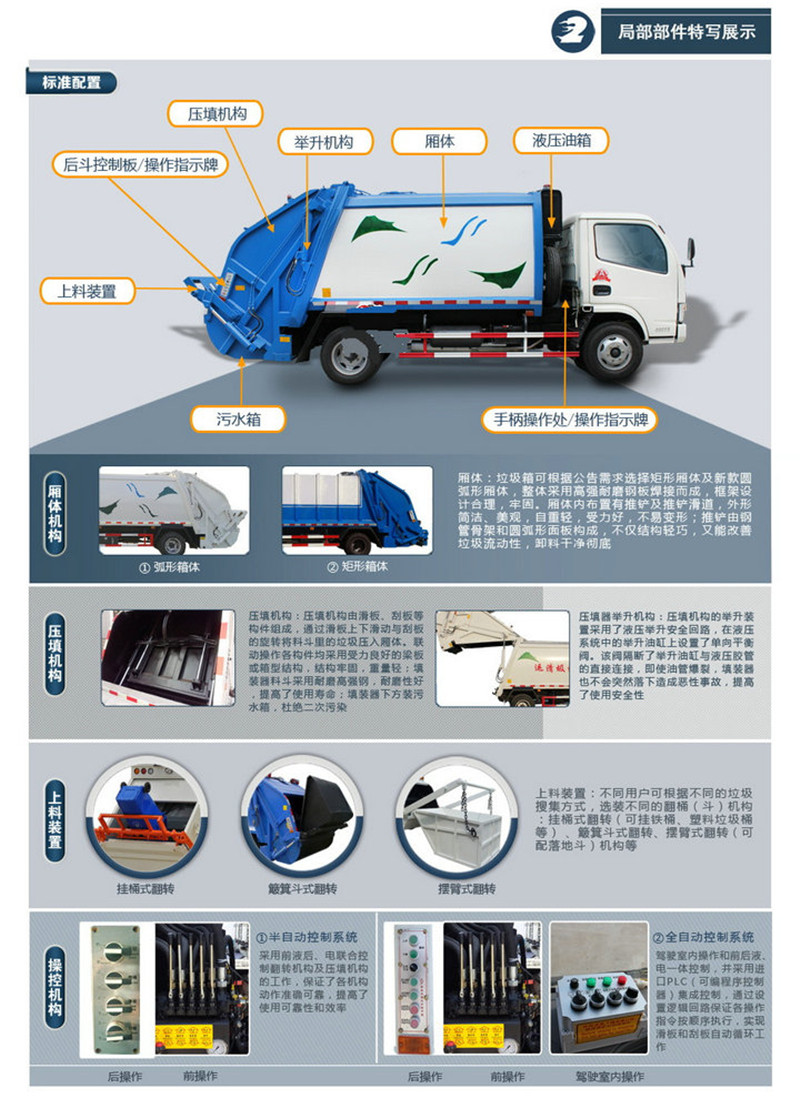 壓縮式垃圾車由密封式垃圾廂、液壓系統、操作系統組成。整車為全密封型,自行壓縮、自行傾倒、壓縮過程中的污水全部進入污水廂,解決了垃圾運輸過程中的二次污染的問題,關鍵部件采用進口部件,具有壓力大、密封性好、操作方便、安全等優點。