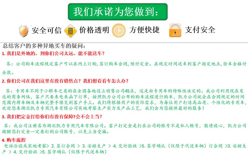 | 2、購車流程: | 1、咨詢洽談(電話洽談或來廠考察洽談) 2、簽訂汽車購銷合同(傳真、郵遞或者來廠簽訂) 3、我廠按時按質(zhì)生產(chǎn) 4、交付驗收 >>點擊查看詳細(xì)內(nèi)容 |